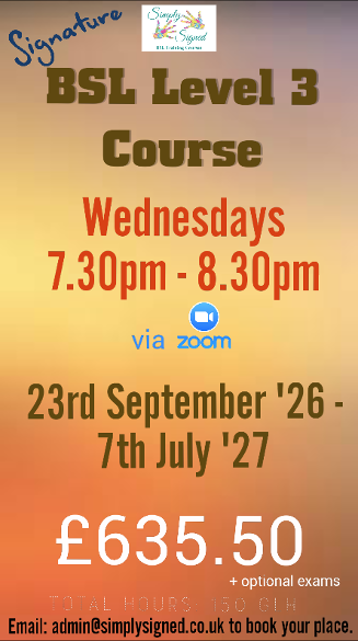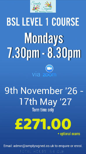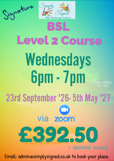 WE HAVE VARIOUS ONLINE AND CLASSROOM COURSES AVAILABLE, TO APPLY FOR A COURSE, PLEASE DOWNLOAD AND RETURN THE APPLICATION FORM BELOW THE ADVERTISED COURSE. ALTERNATIVELY, YOU MAY USE THE Contact us BUTTON OR SEND AN EMAIL TO: ADMIN@SIMPLYSIGNED.CO.UK.